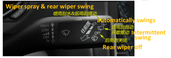 1. Переключатель заднего стеклоочистителя: Чтобы включить задний стеклоочиститель, потяните рычаг стеклоочистителя вперед. Это отличается от способа перемещения переключателя переднего стеклоочистителя вверх и вниз.