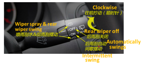 2. Переключатель заднего стеклоочистителя с поворотной ручкой: Поверните рычаг переключателя заднего стеклоочистителя вперед, чтобы включить задний стеклоочиститель.
